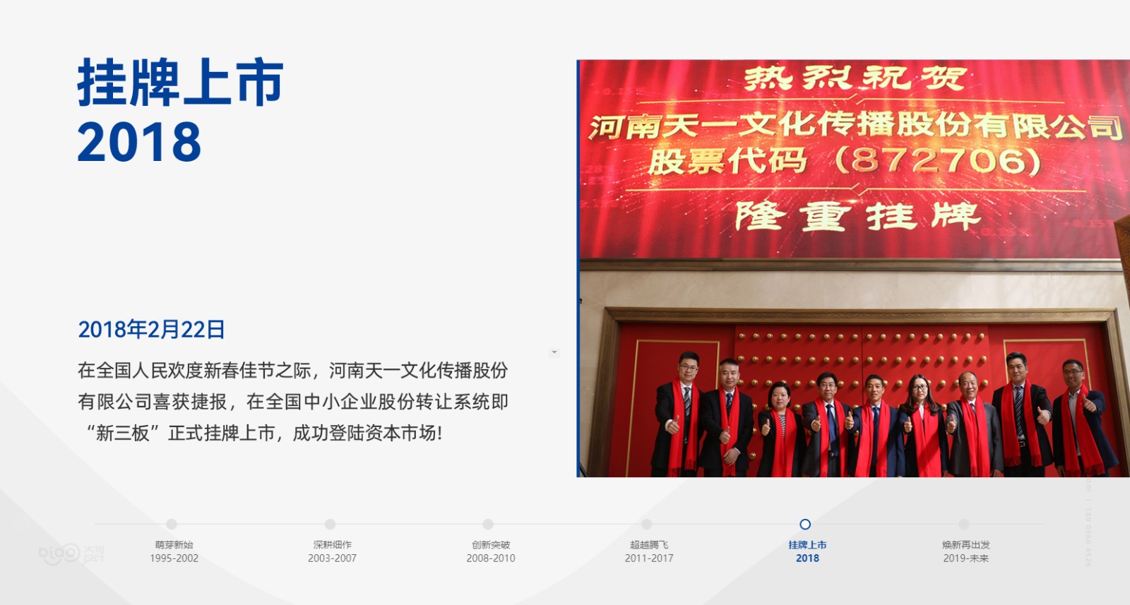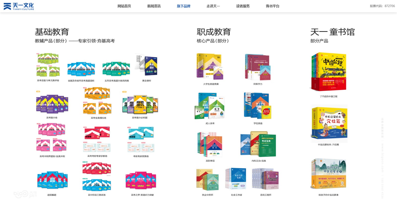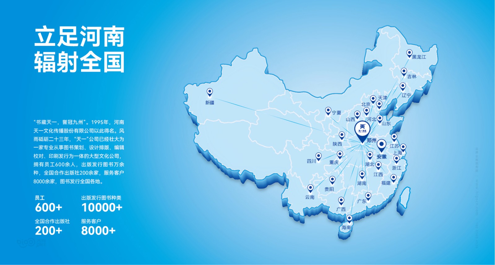 河南天一文化传播股份有限公司,始于1995年,是一家主要从事图书出版发行、数字出版、文化出版、出版服务、教育考试研究、专业资格考试辅导和培训、文化艺术交流活动的综合性文化教育公司。目前,天一文化旗下有天一大联考、天一新奥、天一童书馆、天一文化讲坛等产品品牌,覆盖了学龄前、小学、中学,以及成人自考、成人高考、职业资格培训、考 研等各阶段,为用户提供全周期的产品和学习服务。天一文化现有员工600多人,年销售码洋超过10亿元,累计服务考生千万余人,公司于2018年在“新三板”挂牌上市。
